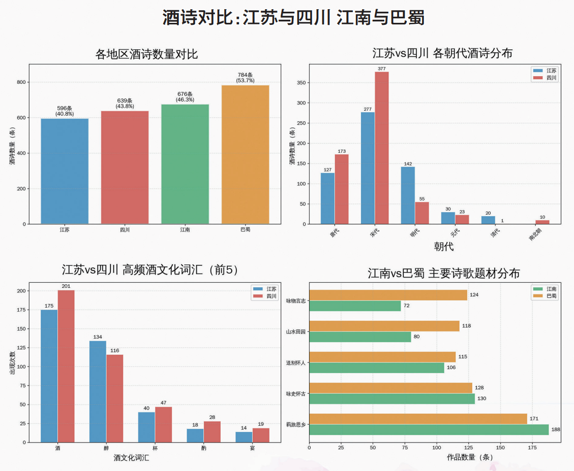 “羁旅思乡”是酒诗里最沉的底色,江南以188首占27.8%、江苏174首占29.2% ,稍超巴蜀171首、四川131首的20.5% 。 四位诗人中,李白在江南创作羁旅酒诗12首,占江南该题材总数的6.4%,“朝沽金陵酒”便是典型;杜甫客蜀期间写下9首羁旅酒诗,占巴蜀该题材的5.3%,“潦倒新停浊酒杯”道尽愁苦;苏轼、陆游各有3首、5首巴蜀羁旅酒诗,分别占当地该题材的1.8% 、2.9% 。两地“酒”字使用均超50次,“醉”字分别达41次、35次,唐宋作品占比超70% ,酒成为四人化解乡愁的共通载体。
