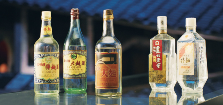 蝉联五届“中国名酒”称号的泸州老窖产品:第一届白塔牌泸州老窖大曲酒(左三);第二届白塔牌泸州老窖大曲酒(左二);第三届工农牌泸州老窖特曲酒(左一);第四届泸州牌泸州老窖特曲酒(右一);第五届泸州牌泸州老窖特曲酒(右二)