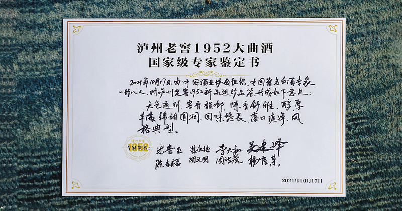 在泸州老窖1952全国发布会上,八位著名白酒专家曾对泸州老窖1952进行了专业品鉴,最终形成了对泸州老窖1952酒体特色的一致鉴评——“无色透明,窖香馥郁,陈香舒雅,醇厚丰满,绵甜圆润,回味悠长,落口爽净,风格典型”。泸州老窖1952传承700余年酿酒名门浓香风骨,收获了专家鉴评团的高度肯定。